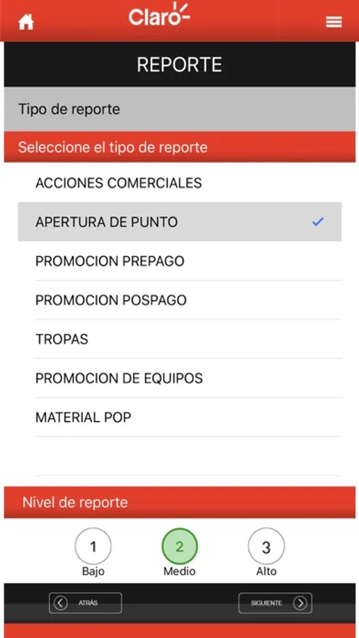 Esta aplicación permite al usuario, a través de simples pasos, reportar las actividades de Claro a nivel nacional. Al momento de iniciar el reporte aparecerá una serie de campos de opción múltiple que ayudarán a ubicar, describir y clasificar la actividad.