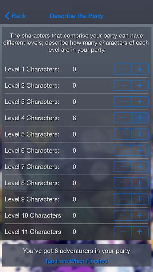First, describe the character levels that comprise your party. The app can handle any reasonable number of characters, at levels up to 20. You could, for example, specify that your party is made up of three level-4 characters, one level-5 character, and one level-6 character.