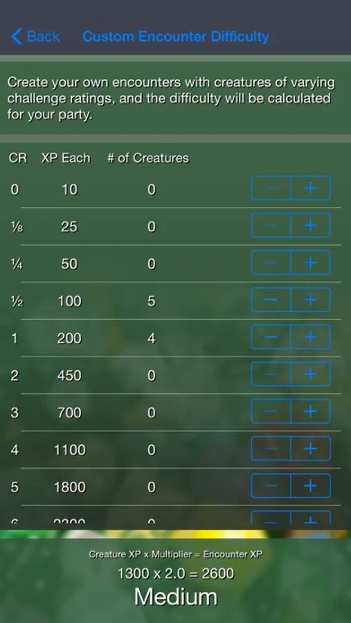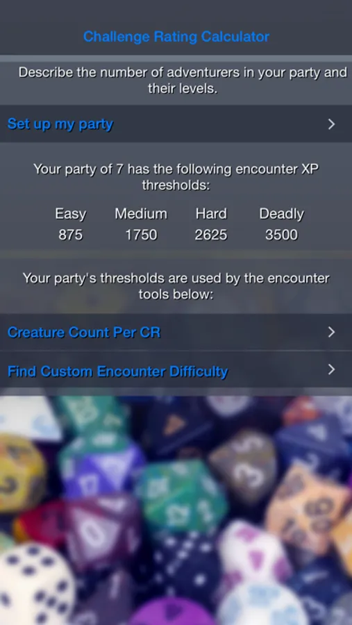 Once your party is defined, the app will tell you the XP thresholds appropriate for challenges of easy, medium, hard, and deadly difficulties. Those thresholds become the basis for a couple of other features: Creature Count per CR, and Custom Encounter Difficulty.