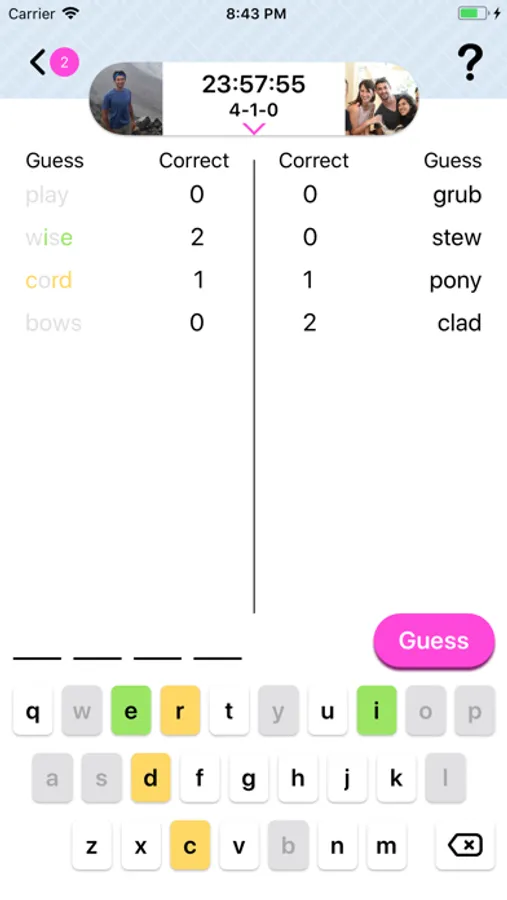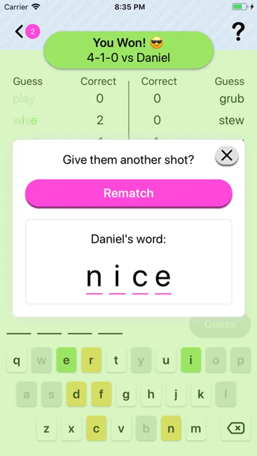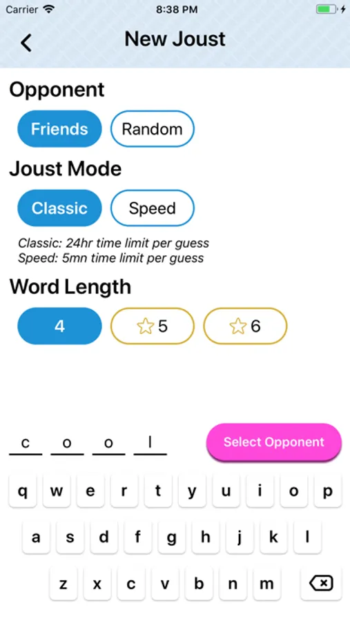 Word Joust will let you know how many letters in your guess are in your opponent’s word. It’s up to you to use that information to crack the code and defeat your opponent!