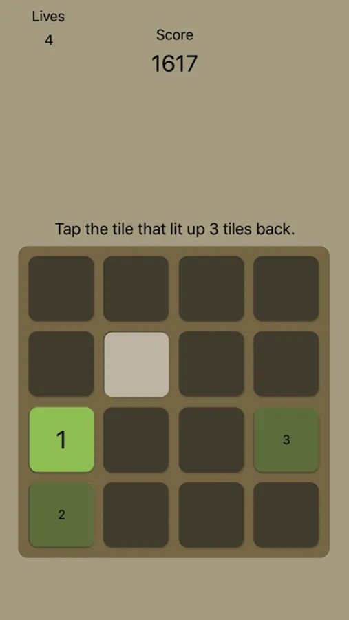 Previous is a simple but difficult and addictive N-back game. In Previous, you start out just tapping the tile that lit up, but on the next level you have to remember the tile one back, then the tile two back, and so forth.