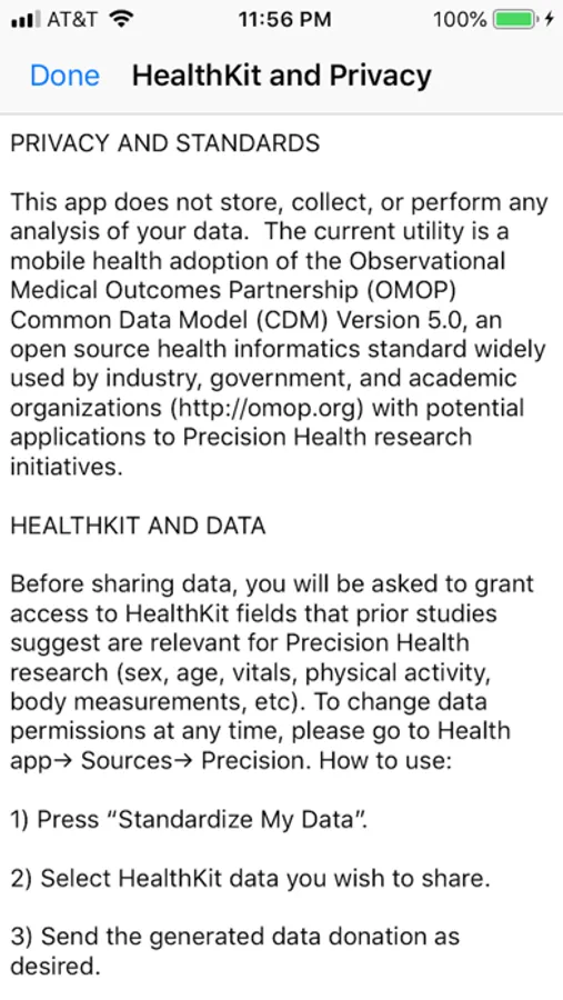 Our app does not store, collect, or perform any analysis of your data. It is a mobile health adoption of the Observational Medical Outcomes Partnership (OMOP) Common Data Model (CDM) Version 5.0, an open source health informatics standard widely used by industry, government, and academic organizations (http://ohdsi.org) with potential applications to Precision Health research initiatives.