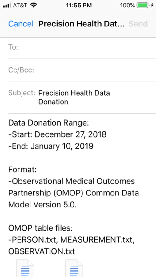 Precision Health initiatives will require research that not only uses a person’s clinical and genomic data, but their mobile health (mHealth) data as well. This app leverages HealthKit and integrates with the Health app to help Precision Health organizations build a standardized Precision Health mHealth database for Precision Health research. It is a simple utility that lets people choose baseline Health app data they wish to share, creates standardized (OMOP CDM v5.0) files that Precision Health researchers can understand, and allows them to email their donation to any Precision Health project of their choosing. Before sharing data, users will be prompted to grant access to specific HealthKit fields relevant for Precision Health research (sex, age, vitals, physical activity, body measurements, etc).