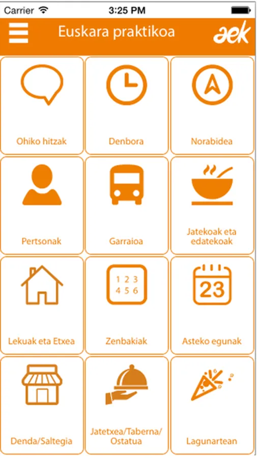 AEK-ren aplikazioa da. Bertan, oinarrizko elkarrizketetan moldatzeko hitzak nahiz esamoldeak aurkituko dituzu. Aurtengo berrikuntzetako bat da hiztegiarekin aritzeko jarri dugun jolasa. Era berean, hurbilen duzun euskaltegiari buruzko informazioa eskura dezakezu; nahi izanez gero, bertara idatzi eta AEK-ren euskaltegietako eskaintzaren nondik norakoak ezagutuko dituzu.