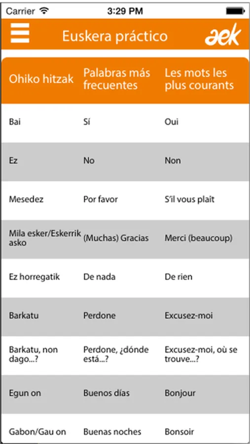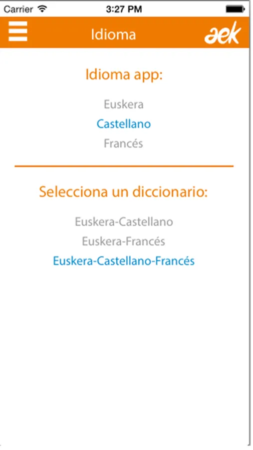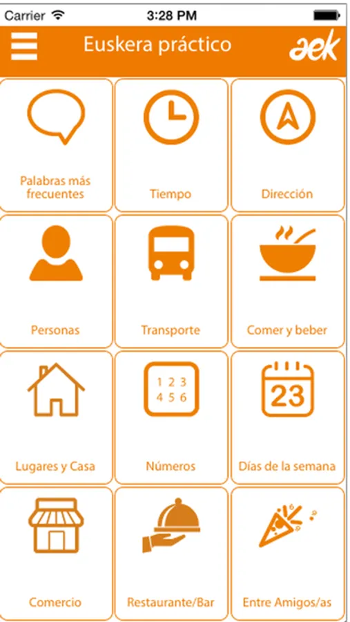 Aplicación de AEK. En ella encontrarás palabras y expresiones para poder desenvolverte en las conversaciones más básicas. Una de las novedades de este año es el juego que hemos añadido para utilizar el diccionario.