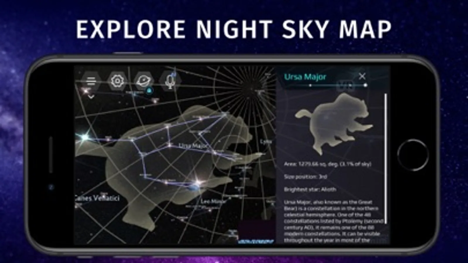 Interactive app Stellar Sky — Planets Map is a unique guide to the night sky with an accurate description of space objects. The AI voice assistant makes it easy to navigate the sky and brings more fun to your journey through the galaxy!