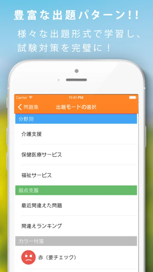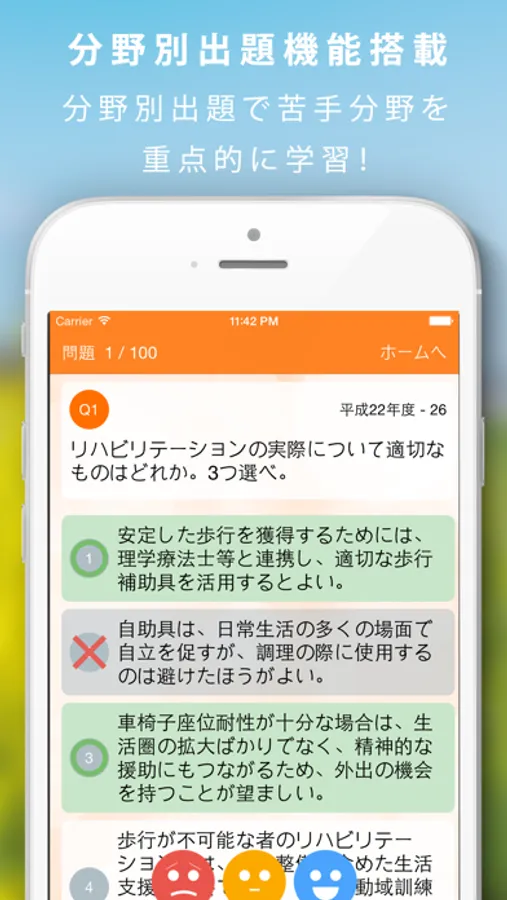 開催別、分野別、苦手な問題などから独自の問題セットを作成することができ重要な項目を徹底的に勉強できます。復習用にカラー付箋(ふせん)を使用したり、間違い回数が多い問題だけを解けるのでスキマ時間に、いつでも、どこでも効率的な学習が可能です。成績機能も充実しており、解答率、正解率、分野ごとの分析されます。