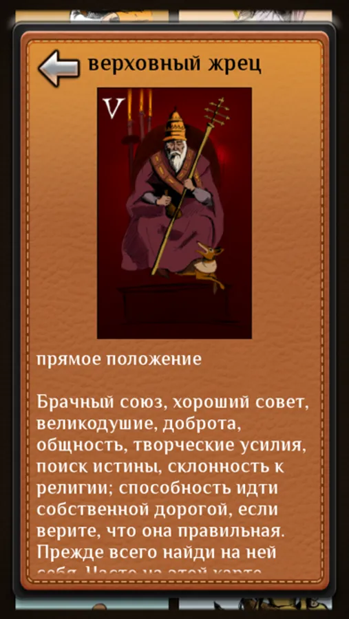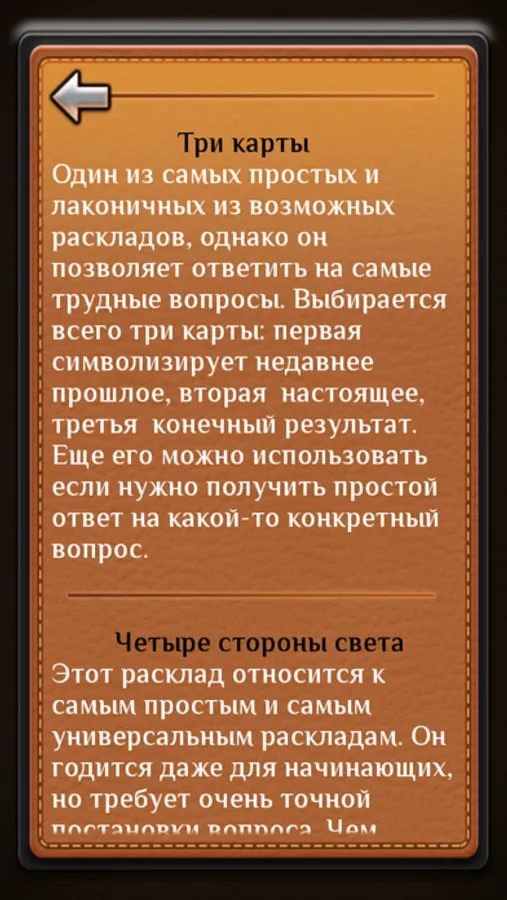 В данном приложении доступны 7 видов гадания, подходящие практически ко всем случаям жизни, от одной карты позволяющей получить быстрый ответ на интересующий вопрос, до расширенного гадания из 21 карты – полностью раскрывающего дела минувших дней, и описывающие текущие и грядущие события.