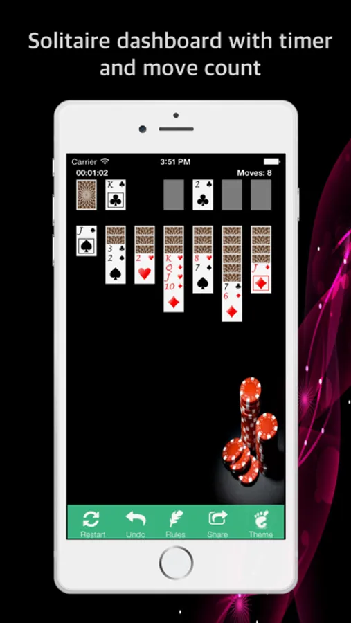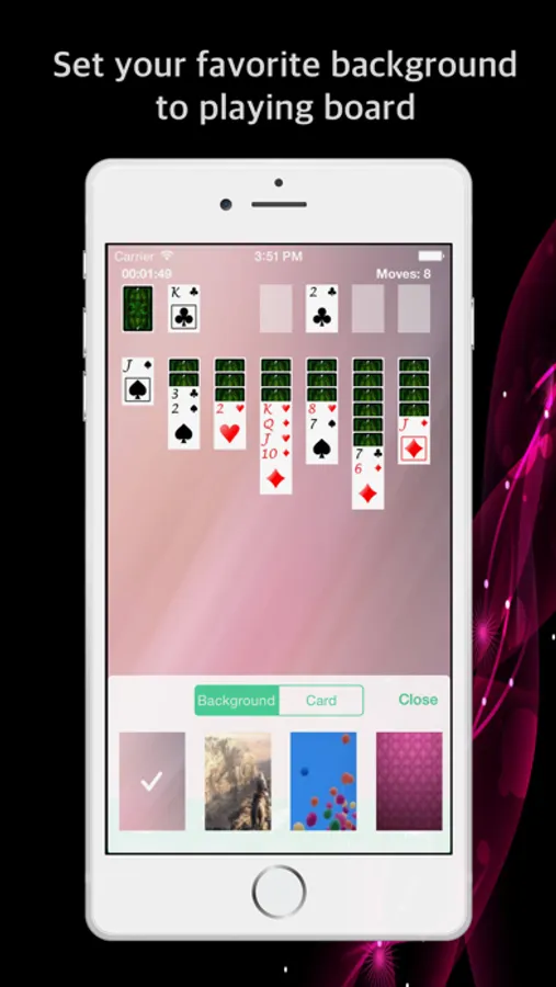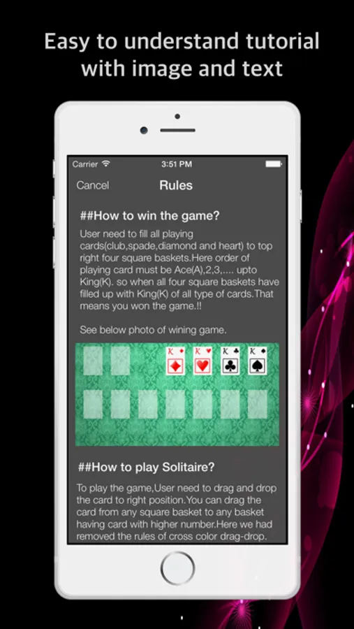 User can set his suitable background and playing card front page. Playing cards are specially designed to get the maximum view of card font and symbol. For new players, it also has a rules screen where a user can learn about how to play solitaire and win it.