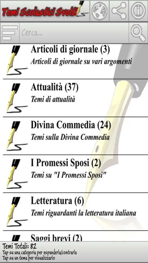 The themes are all in Italian and include topics such as literature, history, current events, Divine Comedy and more.