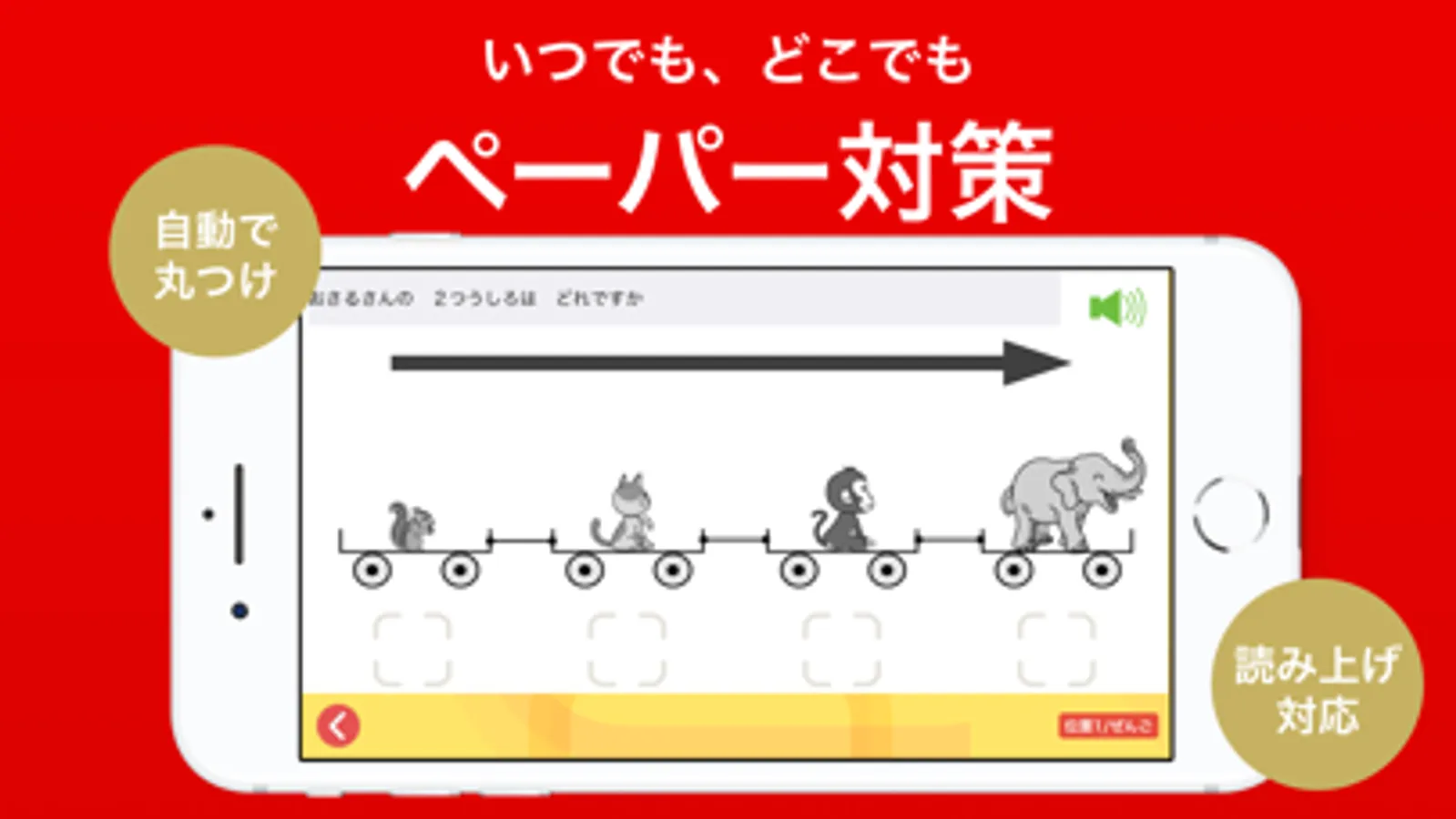問題文はすべて読み上げ可能で、回答は自動で採点します。かんたん操作で高機能なのに、とっても使いやすい。お話や記憶の問題も、こどもひとりで学べるように設計されています。