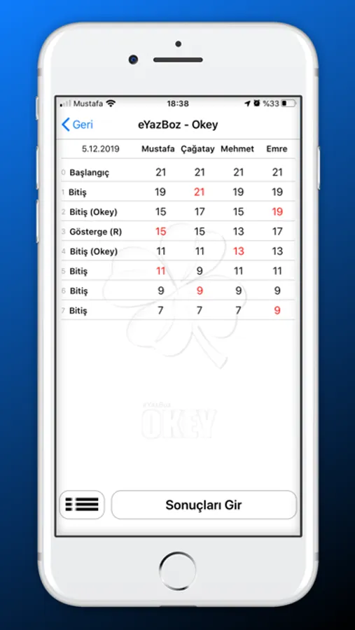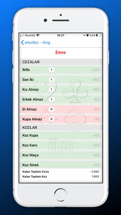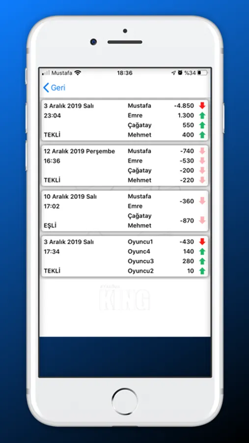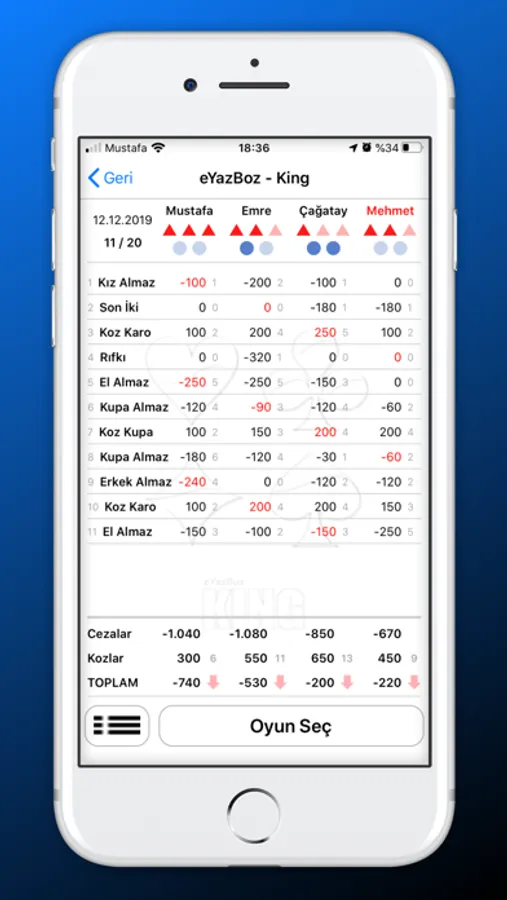 - KING ve OKEY için eşli ve tekli oyun skorlarını tutar