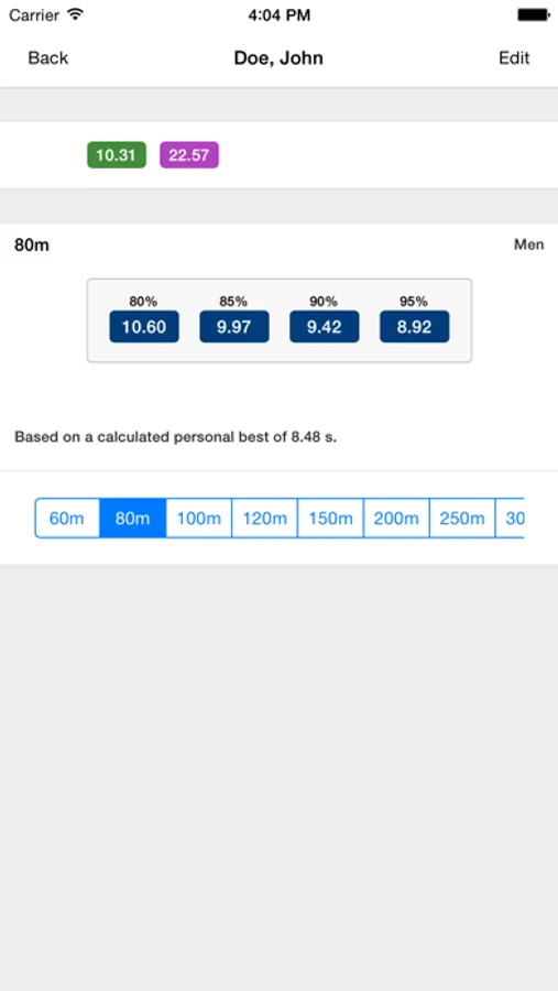 Sprintulator calculates the sprint times for several running distances between 60 and 400 meters as well as intensity levels based on an athlete's personal bests.