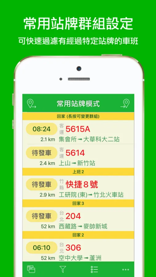 - 可自訂常用站牌群組,可自訂「上班」、「下班」、「旅遊」等群組