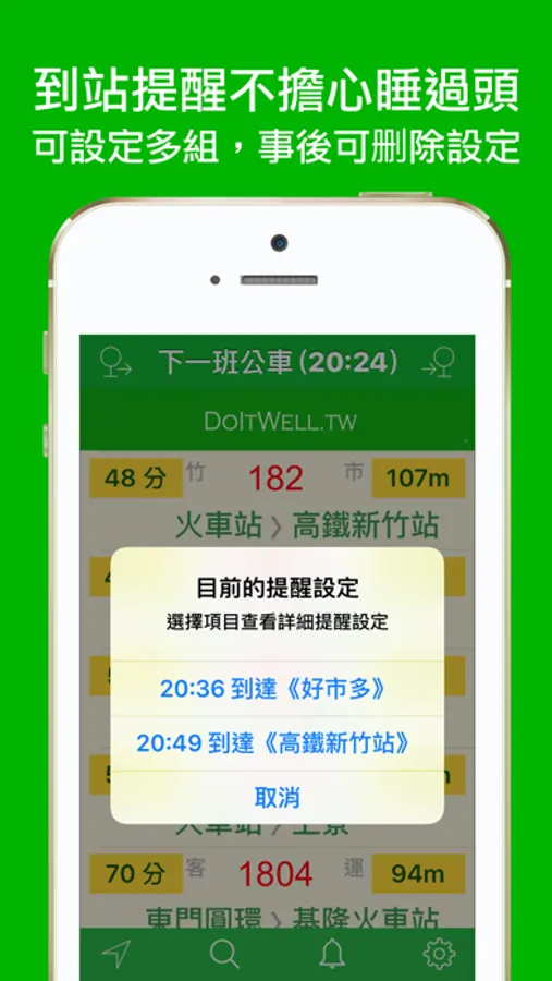- 可設定多組「到站提醒」,不用擔心睡過頭。若事後不需要提醒的話,可取消提醒設定。