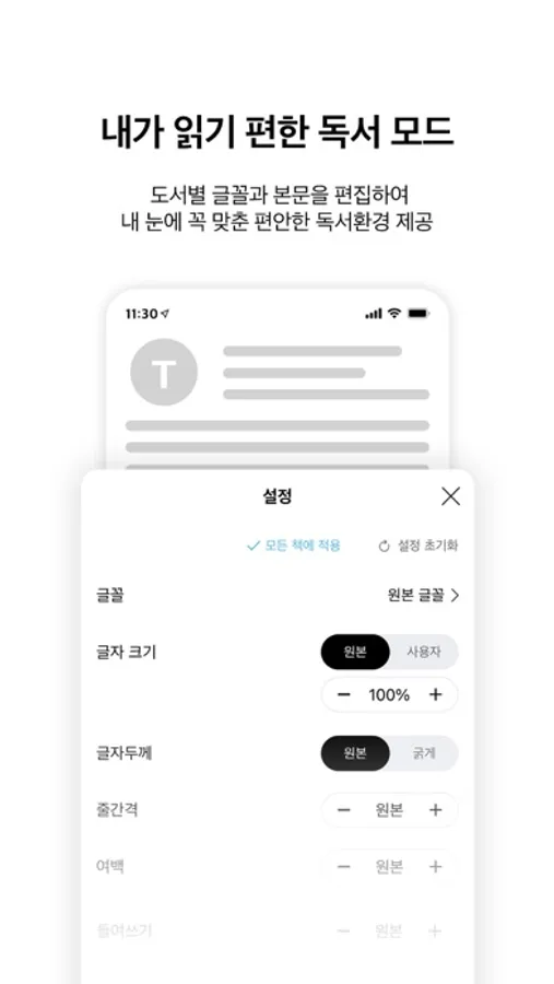 - 글꼴, 글자 크기, 줄간격 등을 도서별로 설정할 수 있습니다.
