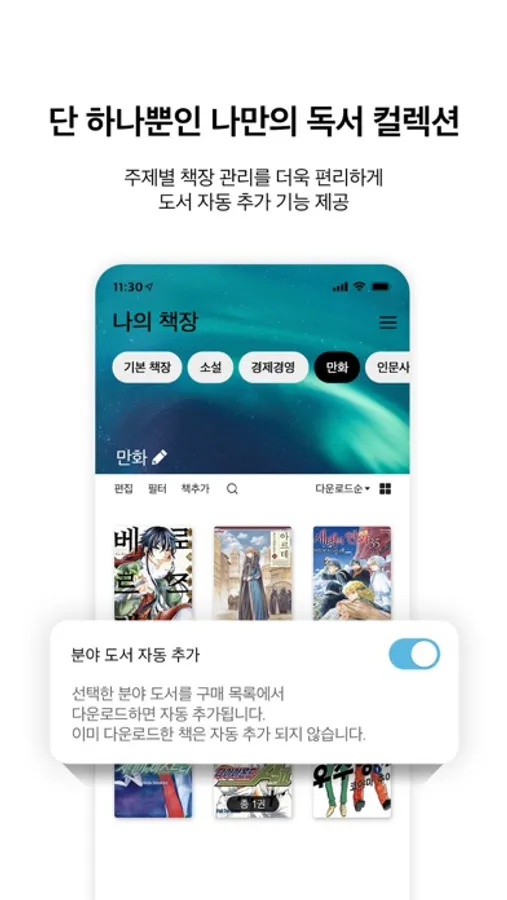 - '선택한 분야 자동 추가' 기능을 이용하여 책장과 분야를 미리 매칭해두면 분야별 책장을 쉽게 만들 수 있습니다.