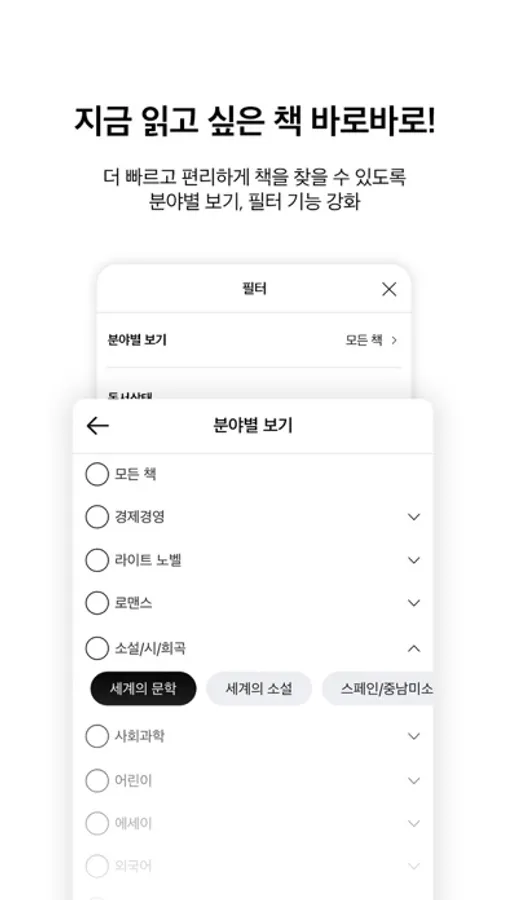 - 책장에서는 분야별 또는 독서 상태, 소장 또는 대여, 파일 형식 등으로 도서를 필터링할 수 있습니다.