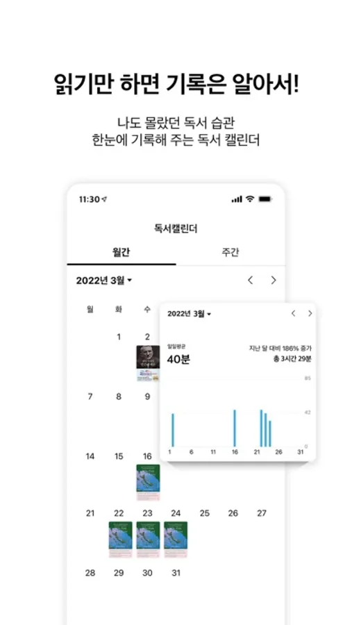 - 읽은 책, 독서 시간, 스크랩 정보 등이 자동으로 기록되어 주간, 월간 단위로 리포트가 발행됩니다.
