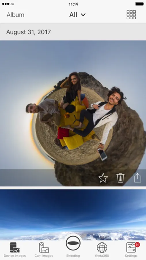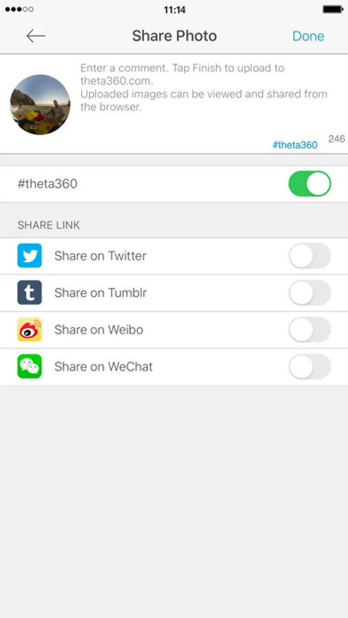 You can share on Twitter, Facebook, and other social network services the spherical images you shoot.