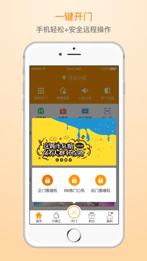 =App功能=万众生活管家结合万众楼宇门禁系统,为社区用户提供日常生活便利服务,核心功能如: