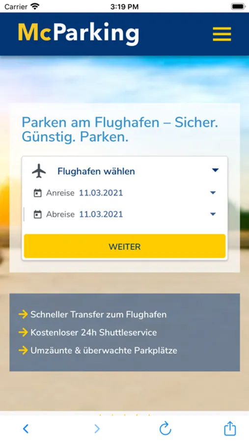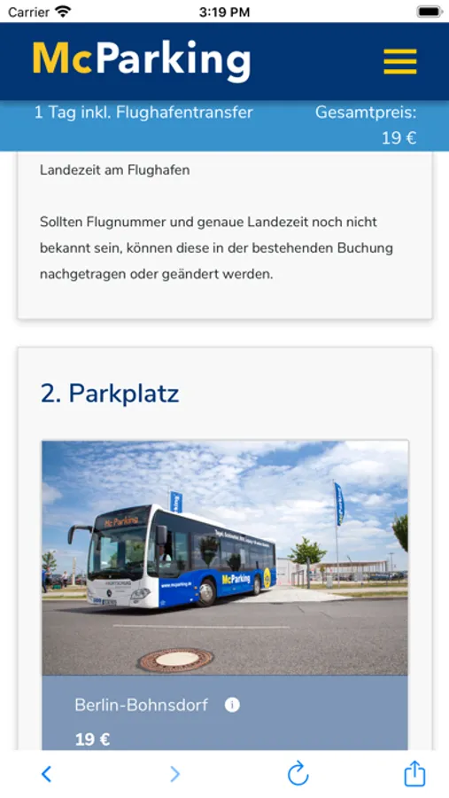 The McParking app allows travelers to book inexpensive and at the same time secure parking options near the airport. Our own parking space at Berlin Brandenburg Airport (BER) is particularly easy to book. Our free shuttle takes you and your luggage to the terminal in a few minutes and picks you up there again. Manage your parking space bookings conveniently on your mobile phone and travel completely relaxed.