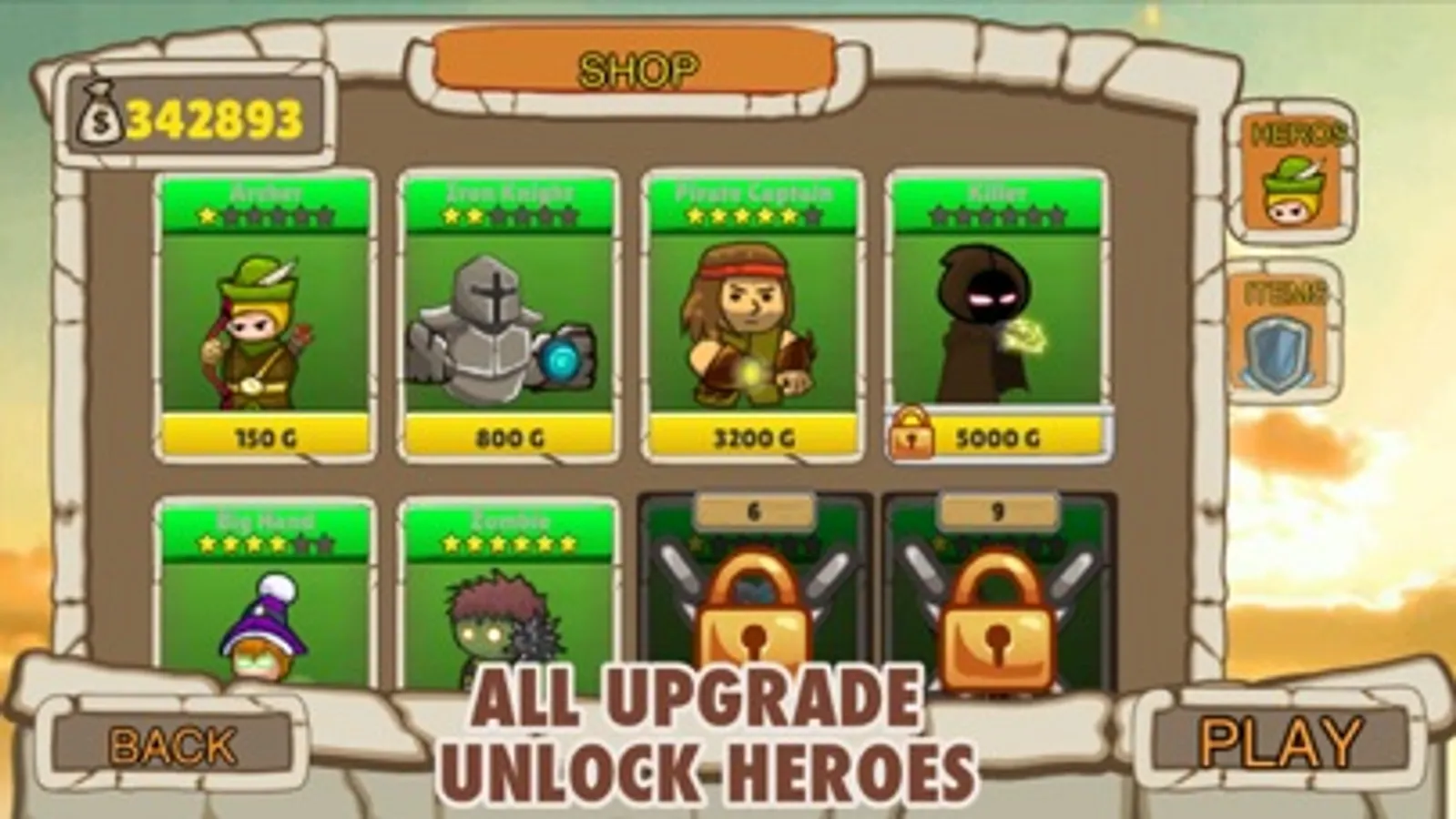 Visit the shop in order to upgrade heroes and unlocked new heroes,temple....