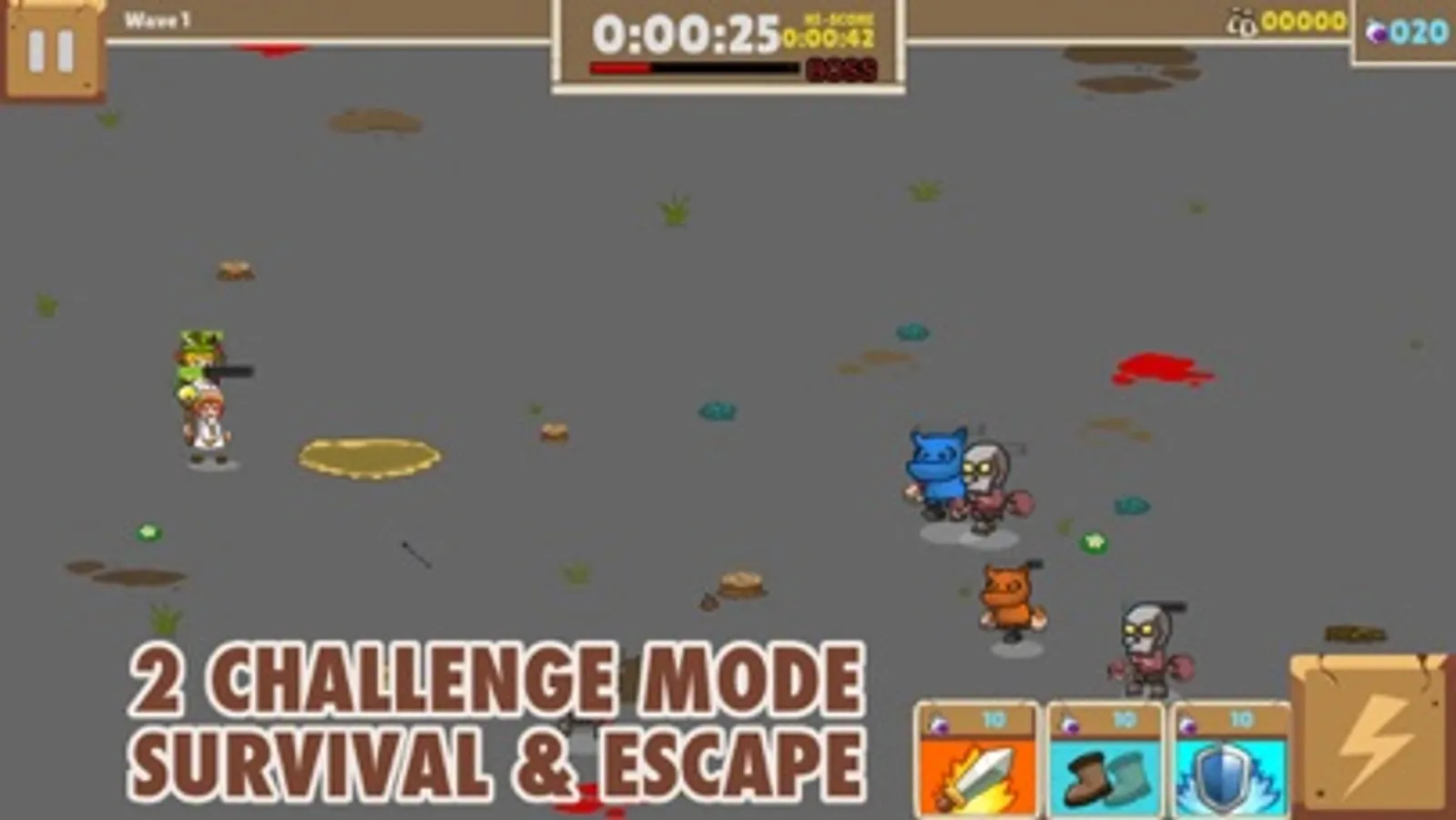 Survive waves to progress, collect more moneys,and unlock new heroes.
