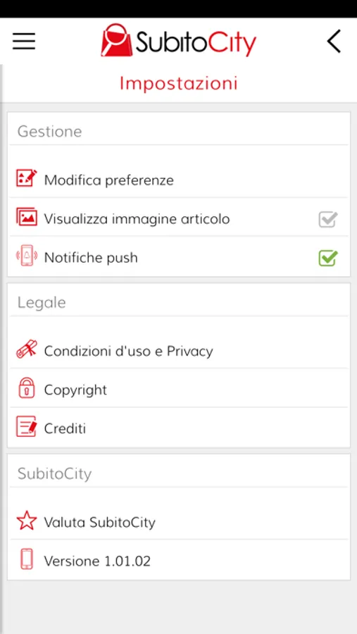 ● Nella sezione “Impostazioni”, è possibile modificare le proprie preferenze o le altre impostazioni in maniera facile e veloce. Puoi abilitare/disabilitare le push notification