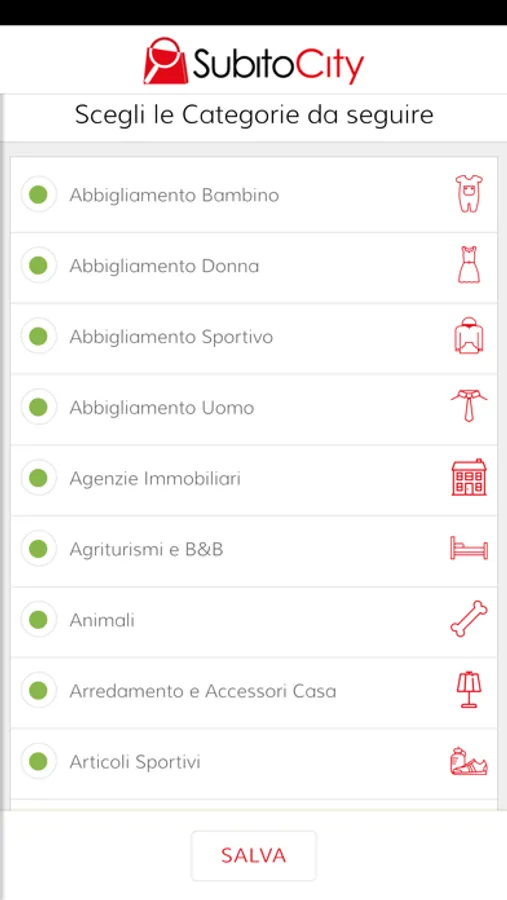 ● Puoi scegliere quali categorie merceologiche seguire: Abbigliamento Bambino, Abbigliamento Donna, Abbigliamento Sportivo, Abbigliamento Uomo, Agenzie Immobiliari, Agriturismi e B&B, Pet shop, Servizi, Veterinari, Arredamento e Accessori Casa, Articoli Sportivi, Articoli da Regalo e Bomboniere, Asili nido e Ludoteche, Gommista, Officine, Autoricambi, Vendita e noleggio auto e moto, autoscuole, autostraporti, Banche e Assicurazioni, Bar e Gelaterie, Bricolage, Ferramenta, Termoidraulica, Cartolerie e Librerie, casalinghi, Centri Estetici e Benessere, Campi, Piscine, Palestre, elettrodomestici, Elettronica, Informatica, Telefonia, Farmacie e Parafarmacie, Fiorai e Addobbi, Fotografi, Giocattoli, Gioiellerie e Oreficerie, Hotel, Alberghi, Idraulici, Falegnami, Elettricisti, Intimo, Amministratori di Condominio, Avvocati, Commercialisti, Consulenti del Lavoro, Ingegneri, Geometri, Notai, Ragionieri, Mercerie, Ottica e Oculistica, Parrucchieri, acconciatori per donna, Barbieri e parrucchieri per uomo, Profumerie, Ristoranti, Pub e Pizzerie, Scarpe e accessori, scuole-di-danza-e-ballo, Serramenti e Infissi, Dentisti, Dermatologi, Fisioterapisti, Medici, Forni, Macellerie, Ortofrutta, Pescherie, Tabacchi, Tessuti e Tappezzeria, Tipografie e Studi Grafici, Viaggi e Turismo così ricevi le news solo di ciò che ti interessa!