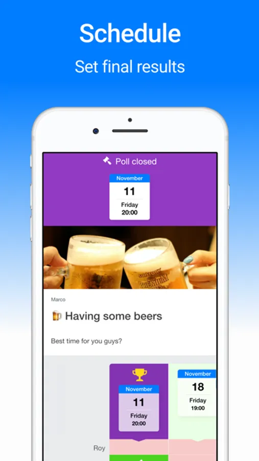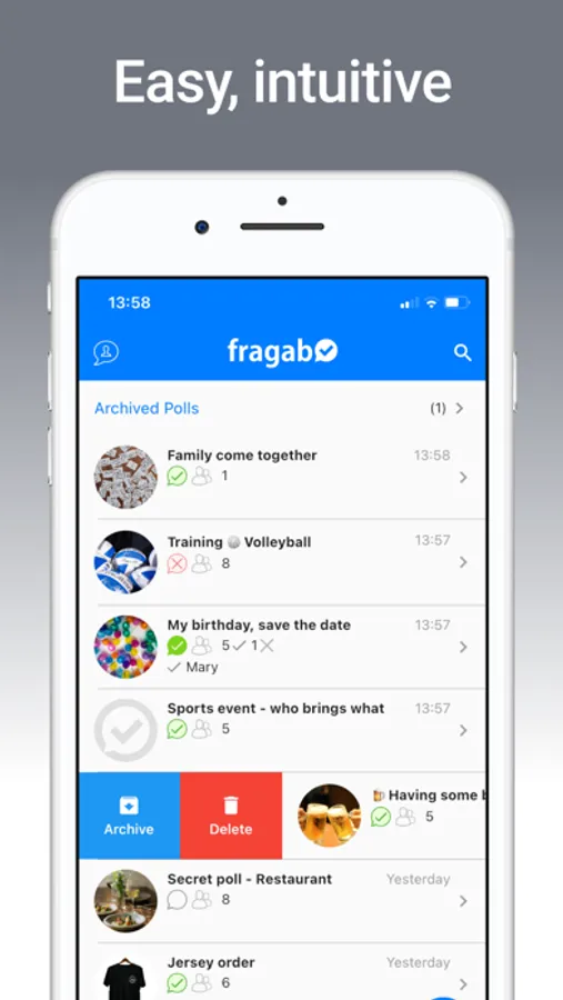 Instead of messing around with long chat histories or searching dozens of emails for answers or feedback, fragab makes planning and scheduling easy and quick! Just create a poll and share the link via WhatsApp, Facebook, email or SMS or invite contacts directly from your address book.