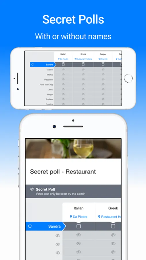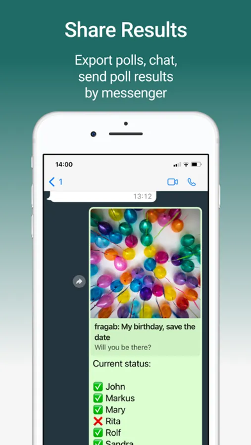 - Separate poll chat, export polls to PDF or Excel, share polls easily by QR-Code, link or SMS, share the poll results via Whatsapp
