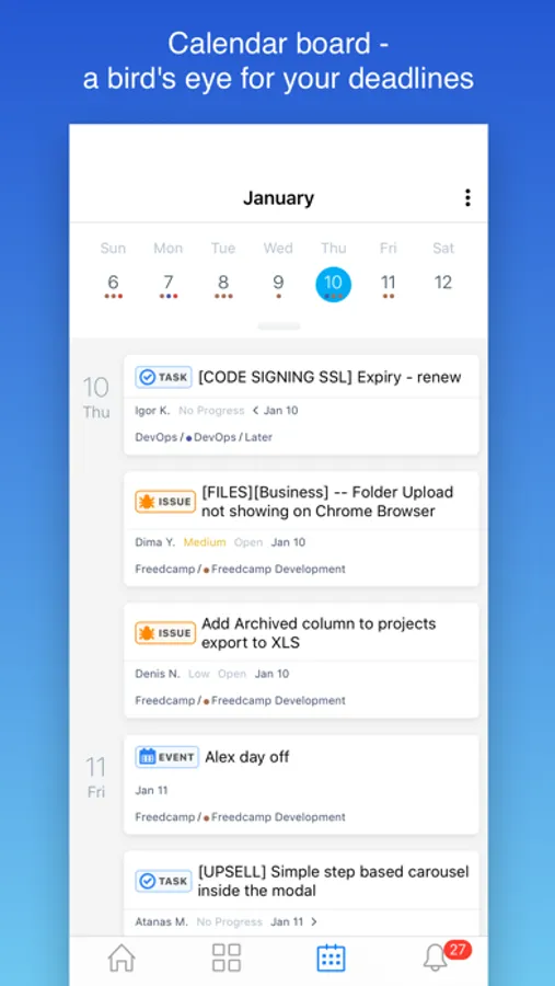 - See upcoming tasks, issues, milestones, events as well as CRM calls and tasks in a combined calendar view