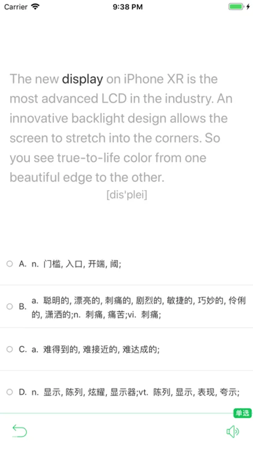 记忆之后再根据单词选择解释,选择正确后进入下一轮背诵。