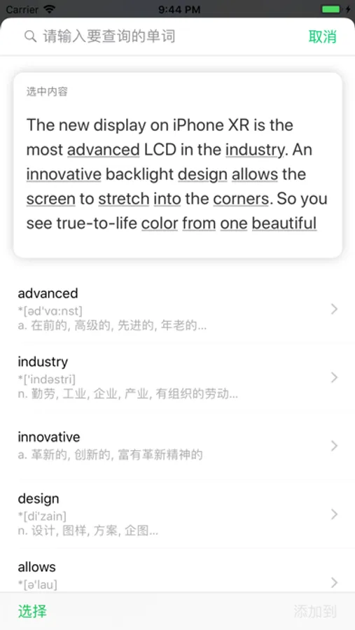 * 添加生词:快速的从其他App添加单词到天天阅词。例如你在浏览网