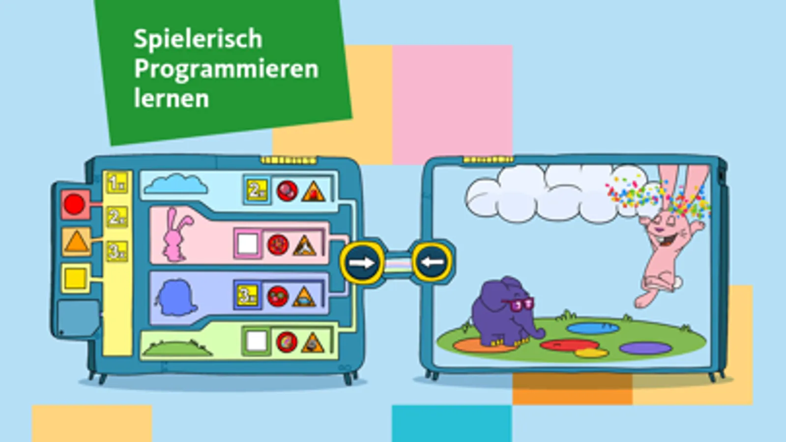 Lernt mit der Wenn-Dann-Maschine Programmieren und bestimmt, was Elefant, Hase, Wolke und Boden tun sollen. In vier verschiedenen Leveln werden dabei spielerisch die ersten Grundzüge des Programmierens vermittelt: das Wenn-dann-Prinzip, Wiederholungen und Ereignisse.