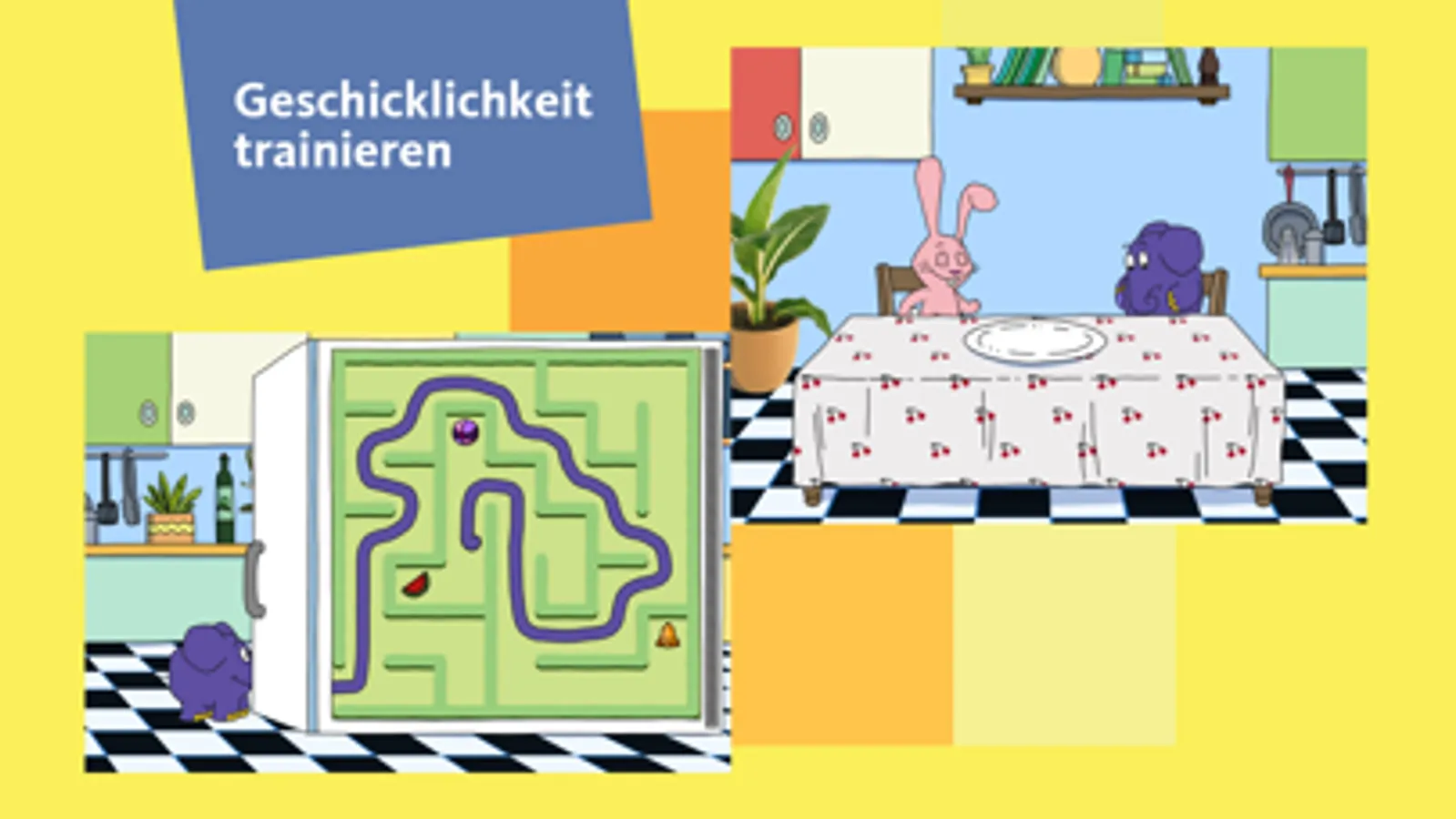 Der Elefant hat Hunger und das Essen ist im Labyrinth versteckt! Helft dem Elefanten und zieht den Rüssel des Elefanten durch das Labyrinth und findet die essbaren Gegenstände. Aber Achtung! Nicht alles ist essbar…