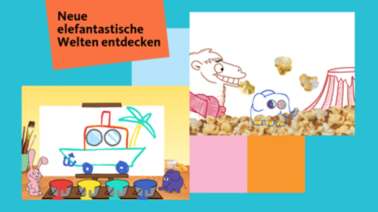 Mit dem Spiel Fantasiemobil könnt ihr eure eigenen, verrückten Fahrzeuge malen und im Anschluss mit Elefant und Hase auf Abenteuerreise gehen.