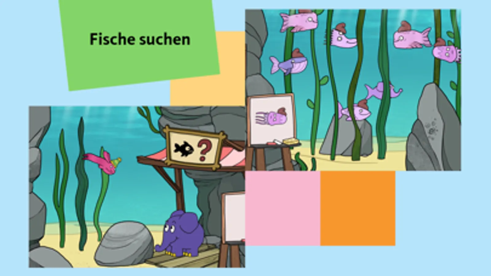 Beim Fisch-Finde-Spiel hat einer der Fische seinen Freund verloren. Helft dem Elefanten, diesen wiederzufinden. Dazu müsst ihr den richtigen Fisch im Meer aussuchen.