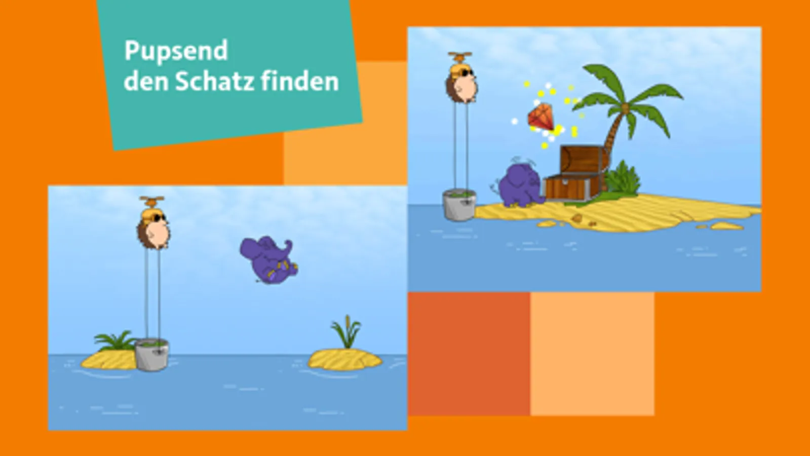 Im Pups-Spiel könnt ihr dem Elefanten helfen, mit seinem Pupsantrieb von Insel zu Insel zu hüpfen, um zum Schatz zu gelangen.