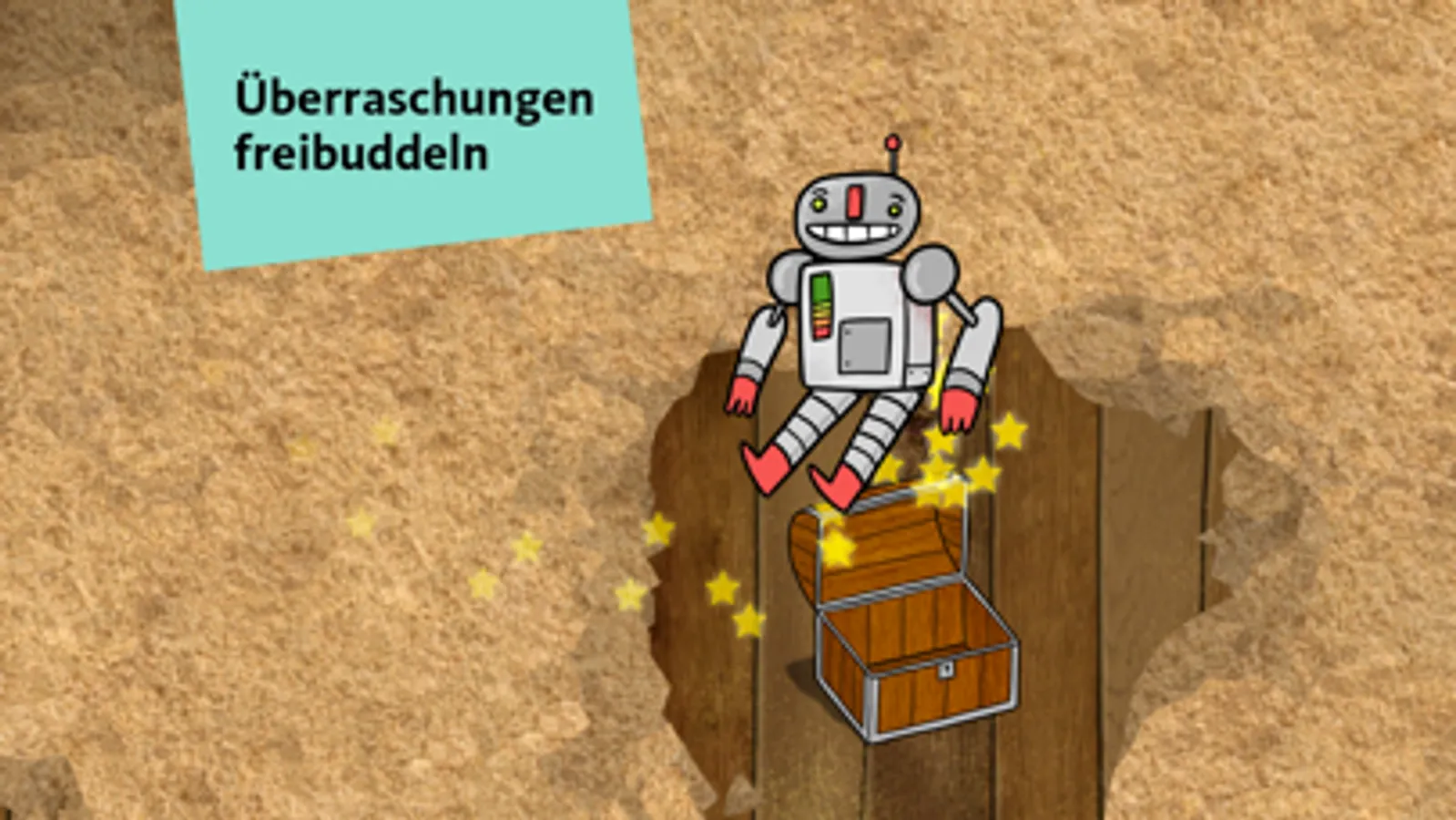 Im digitalen Sandkasten verbirgt sich eine Schatzkiste, die ihr freirubbeln müsst.In der Schatzkiste gibt es immer wieder neue lustige Überraschungen! Extra-Tipp: Man kann es auch zu zweit spielen – wer entdeckt den Schatz zuerst?