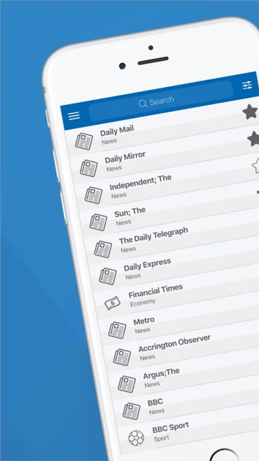 Some of the newspapers you can find are: Accrington Observer, The Argus, BBC, BBC Sport, Belfast Telegraph, Birmingham Mail, Birmingham Post, Business Insider, Burnham and Highbridge, CNET, Coventry Telegraph, Daily Echo, Daily Express, Daily Mail, Daily Mirror, Daily Post, Daily Record, Daily Star, Derby Telegraph, Digital Spy, Eastern Daily Press, ESPN Cricinfo, Evening Chronicle, Evening Gazette, Football365, FourFourTwo, Ipswich Star, Evening Times, Express & Star, Financial Times, Google News UK, Huffington Post UK, IBTimes UK, ITN, Lancashire Telegraph, Lincolnshire Echo, Lifehacker, Liverpool Echo, London Evening Standard, Manchester Evening, Mashable, Metro, New Scientist, NewsNow, Premier League, Reuters UK, Scotsman, Sky News, Sky Sports, Bolton News, The Daily Telegraph,The Economist, The Guardian, The Herald Scotland, The Independent, The TechCrunch, The TechRadar, The Inquirer, The Journal, The Northern Echo, PC Magazine, PC World, The Register, South Wales Evening Post, Sporting Life, Sunday The Times, The Sun, The Times, TV Guide, Wales Online, Wired UK, Yorkshire Post, ZDNet...