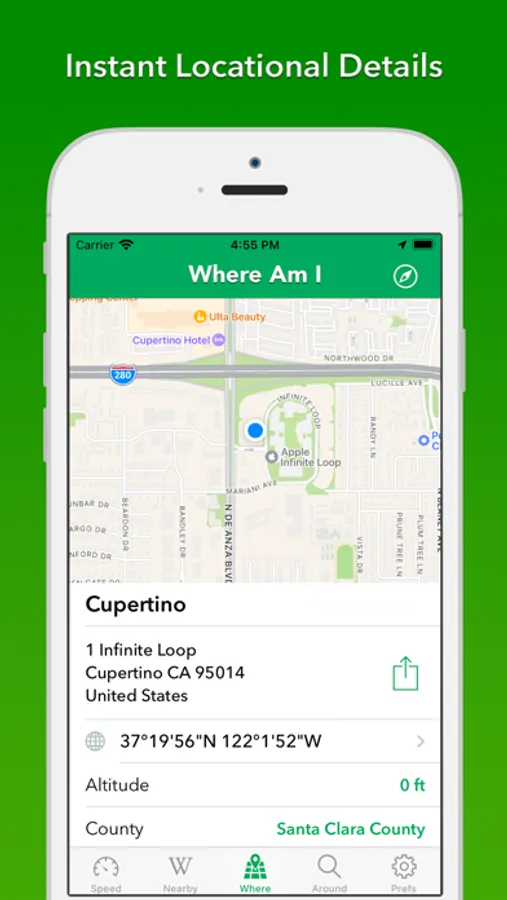Where Am I is a navigational assistant that instantly details your location. Get an approximate address and coordinates instantly and share with a tap. Explore your area with tools to search and discover local attractions and businesses.
