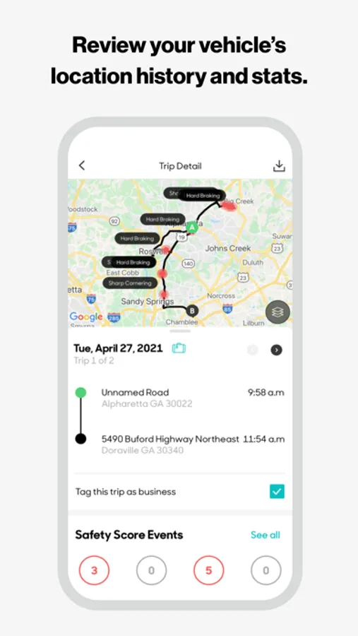 Review your vehicle’s location history and detailed stats by trip, such as average and max speed, mileage, fuel usage, trip time and idle time.