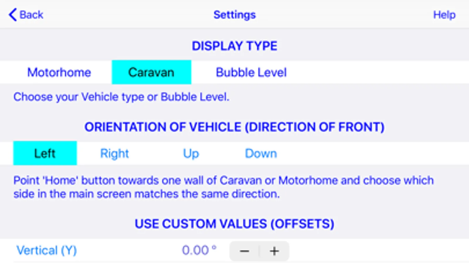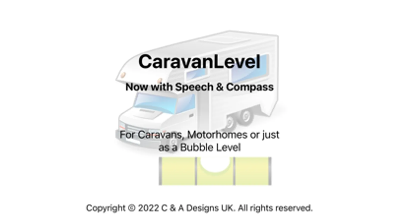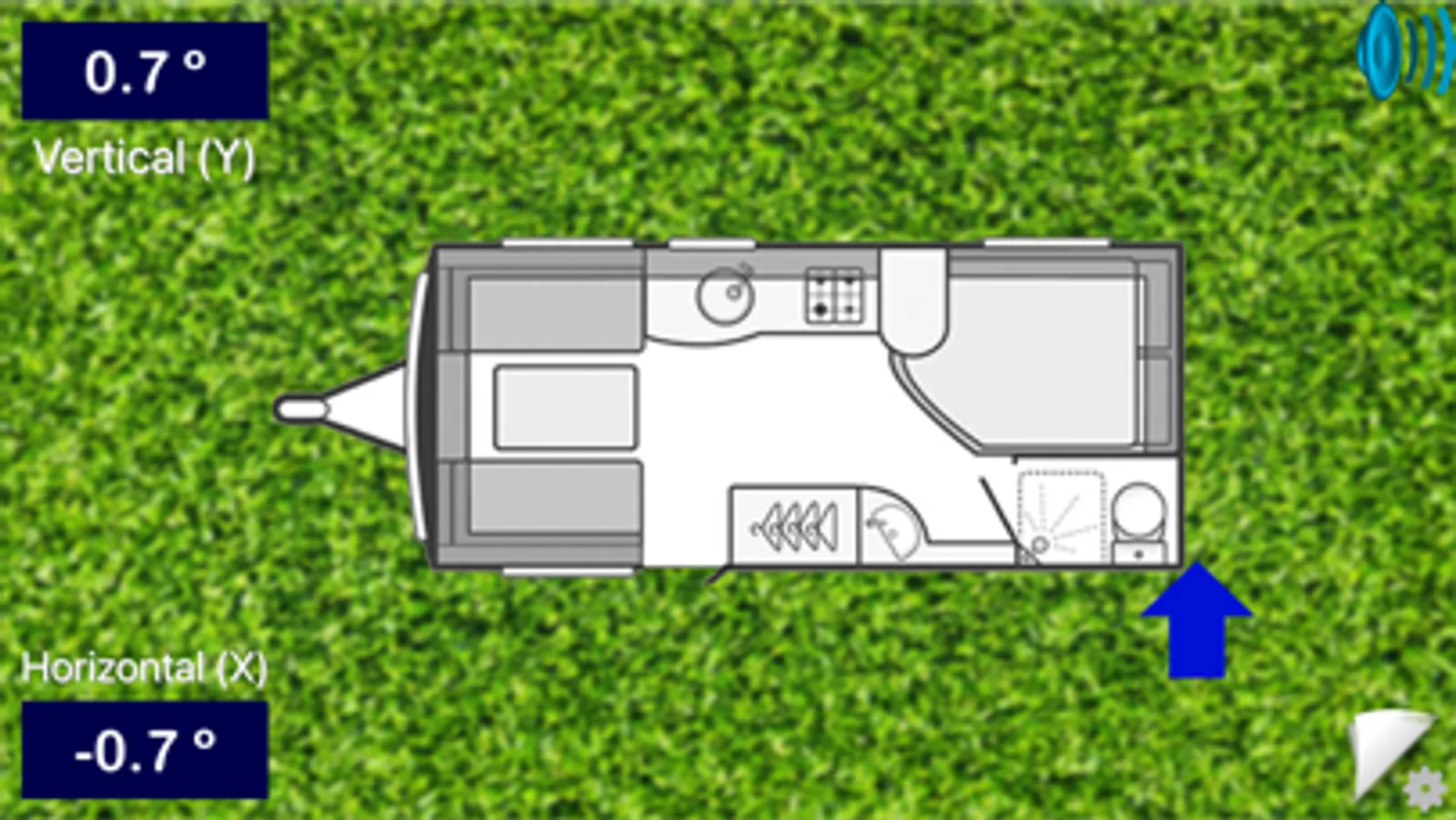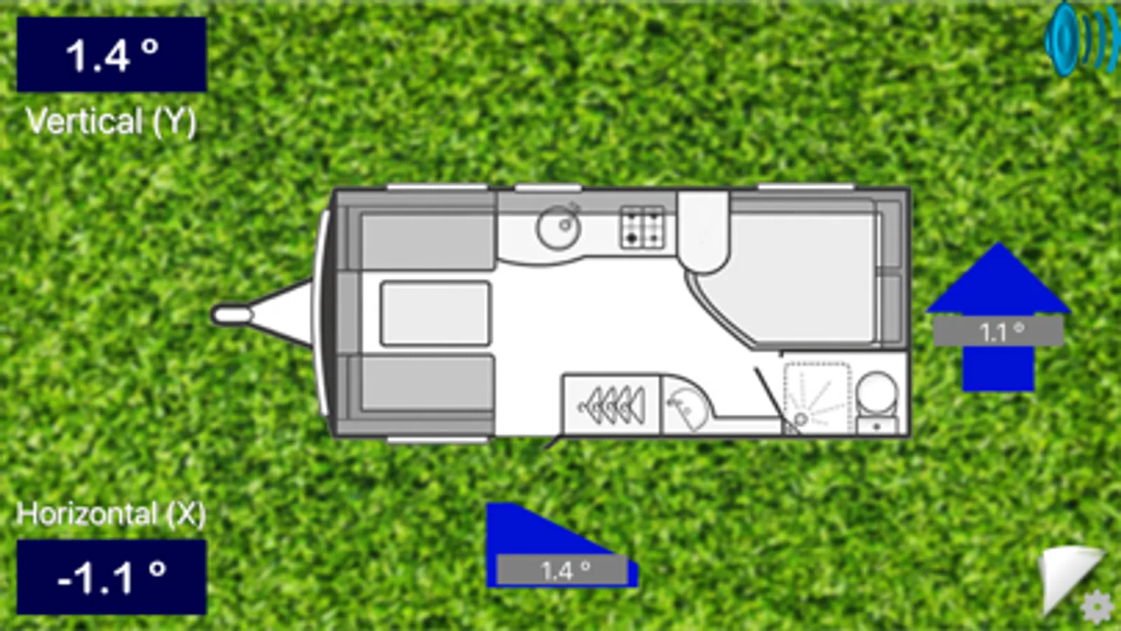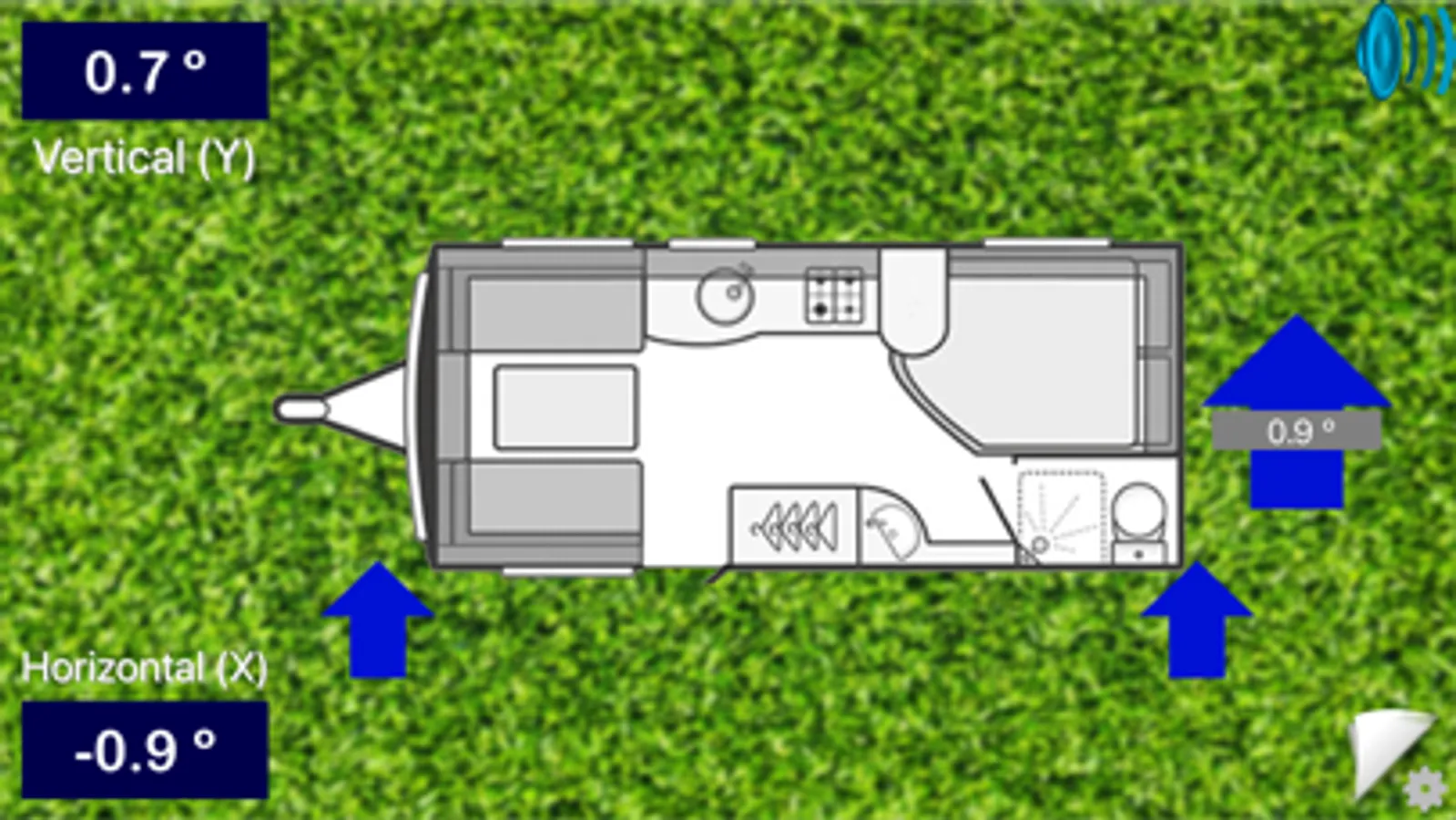 CaravanLevel is aimed primarily for Caravan, Motorhome and RV enthusiasts displaying a diagram with arrows & ramps where its low but would also be useful for general DIY. It has an option to use the built in speech feature so app “says” where on the Vehicle it's low and by how much, then finally when it's all level. If you have chosen to use sounds or better still speech, then with your iDevice volume loud enough and the Caravan door open you can hear where and how much it needs raising in degrees from outside. Most useful of all is if you have a wireless Bluetooth Earbud (which are not too expensive) or wireless Bluetooth Headphones, you can hear as you walk around the outside making adjustments the amount Caravan or Vehicle is low. Alternatively it has the ability to play sounds indicating when the iDevice is low, nearly level or completely level but you need to see the screen as well so you know which area is low.