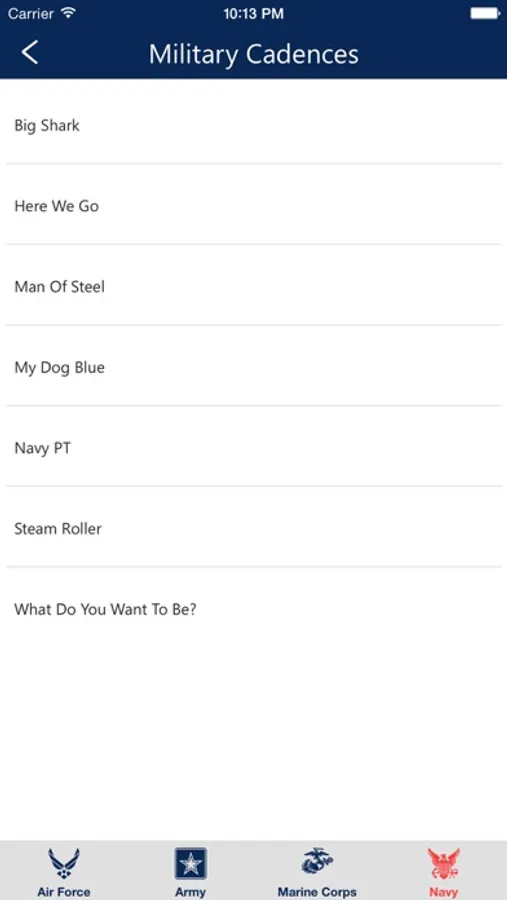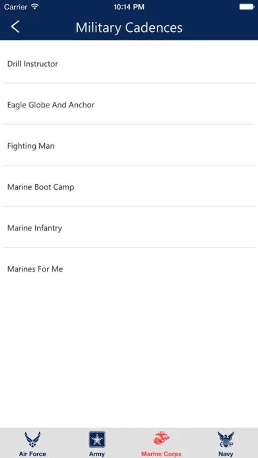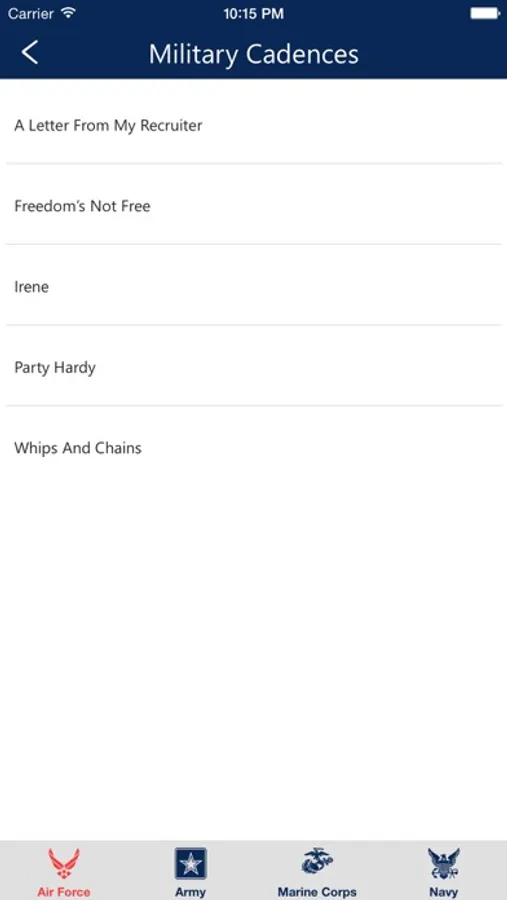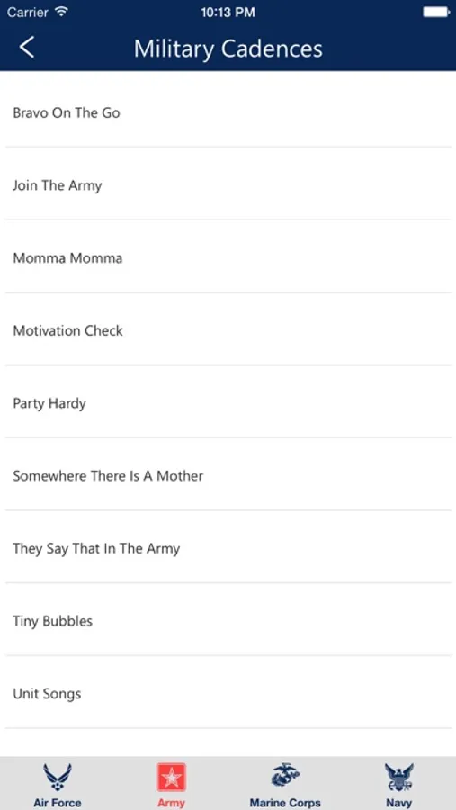 Reference marching and running jody calls old and new from the four major military branches of the United States, all in one place. Easily sort through the app to find the exact cadence you're looking for.