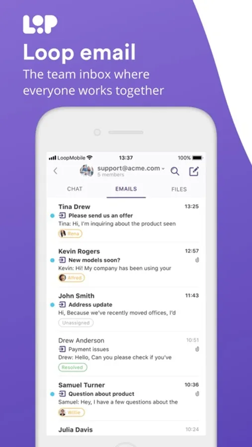 Loop is a simple yet powerful team inbox, easy to set up and use for teams handling customer messages via email. With Loop no messages get missed and your team can assign ownership, chat about customer emails, exchange files, automate workflows and manage shared inboxes with ease, all within a purpose-built iOS app.