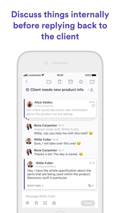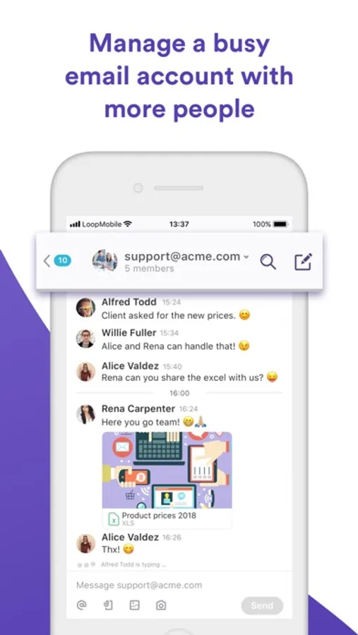 Loop Email helps teams manage customer messages in shared email accounts such as support@, contact@, info@, orders@ and more. Efficiently and on the go.