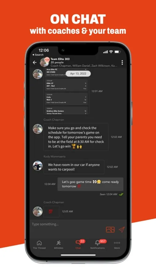 Track your team's roster, communicate with team chat, get event notifications and check your game schedule on Sports Thread.