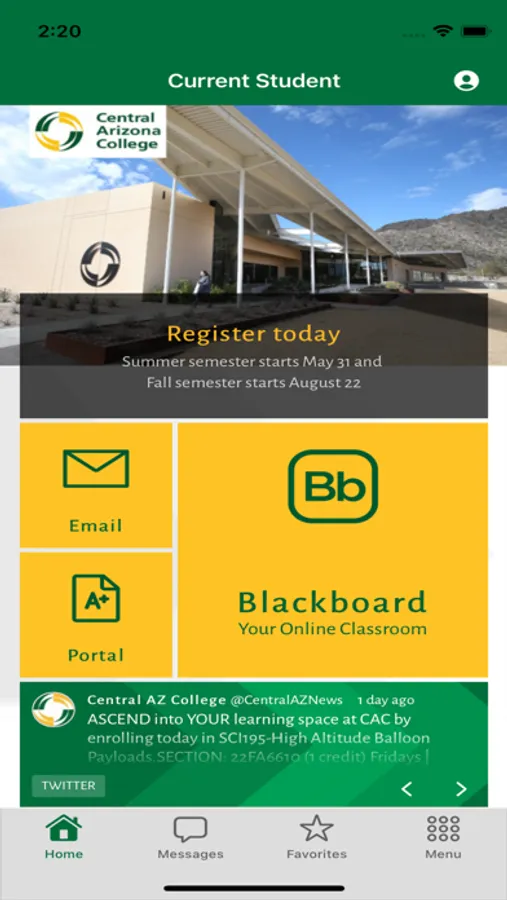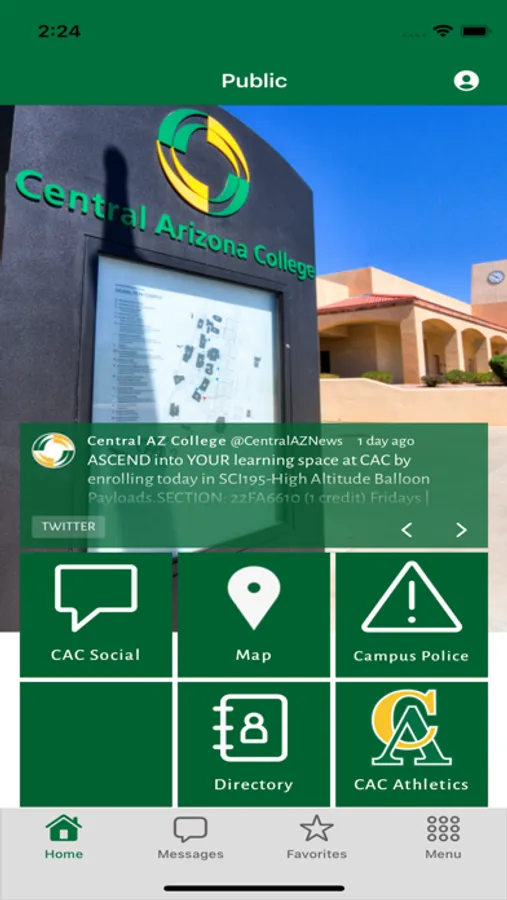 The Central Arizona College app brings the campus to your fingertips and enables you to connect with the CAC community whether you are a future student, current student, employee or community member. Be notified of important dates, deadlines, and security announcements. Access campus resources and technology 24/7.